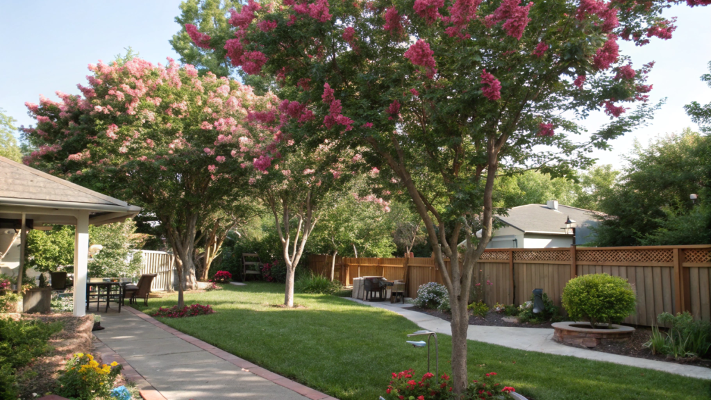 4. Family Backyard Layout with Tall Flowering Trees for Shade + Beauty
