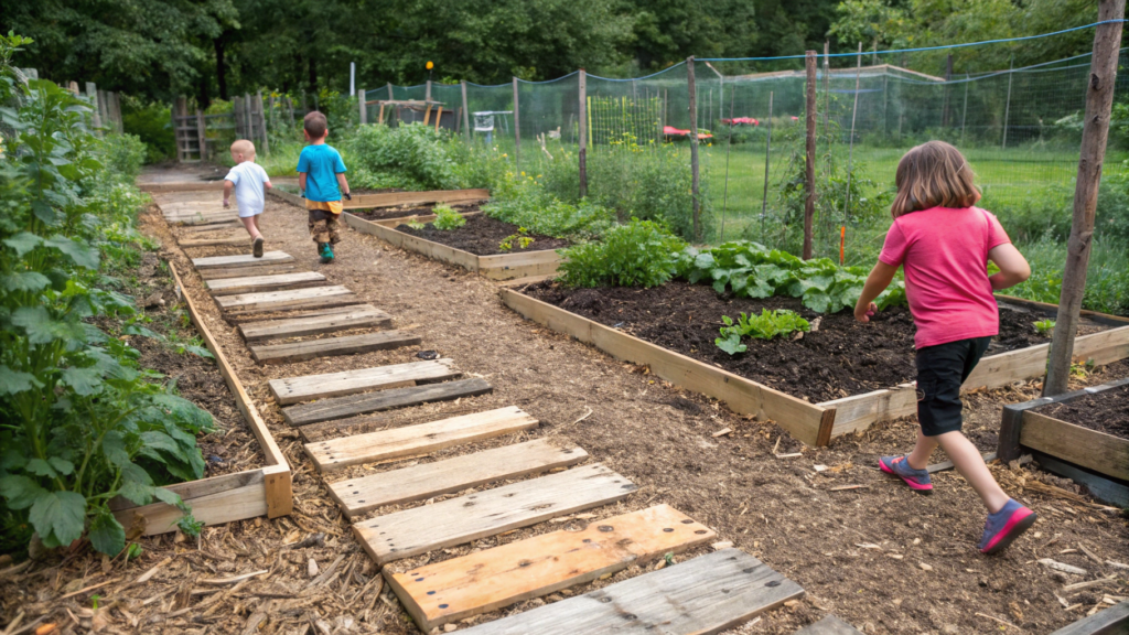 Plus, walkways give kids an actual route to run on — a “track” that keeps your garden beds from turning into a racetrack.