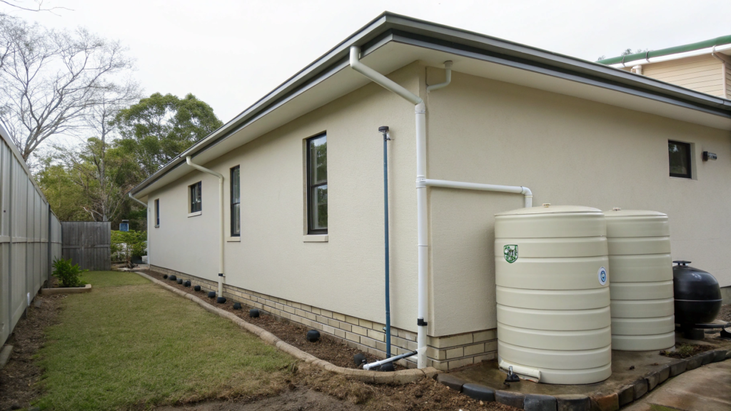 At first glance, it looks like a simple clean house or shed wall. But take a closer look—and there it is: a flat, wall-mounted rain tank, perfectly color-matched to blend in. No bulky barrel, no yard space needed, no visual clutter.