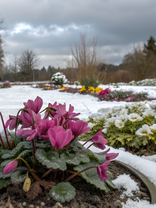 - Plant according to the layout. Combine tall and low varieties, tight but not crowded. A good pattern is alternating: bright — calm — variegated. Place each plant 6–10″ (15–25 cm) apart. At corners, use larger specimens to create visual “points.”