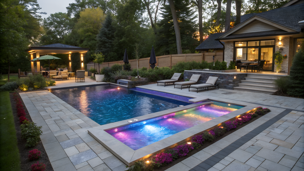 Well, this one’s cooler—recessed RGB lighting built right into the pool floor or steps. Almost invisible during the day, but at night it gives that amazing glowing-water effect. Especially with color transitions.