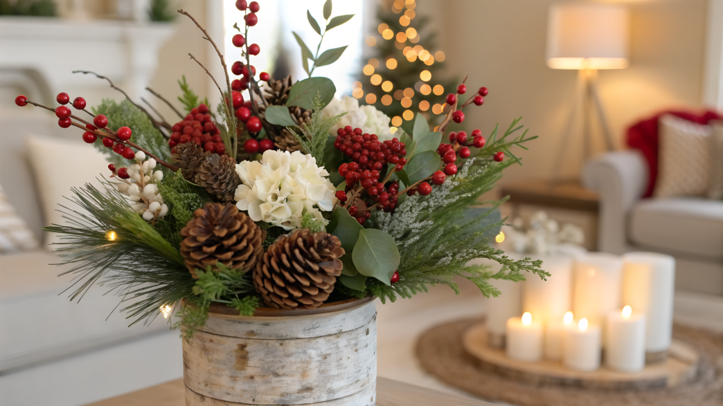 1. Frosted Pine and White Rose Living Room Display