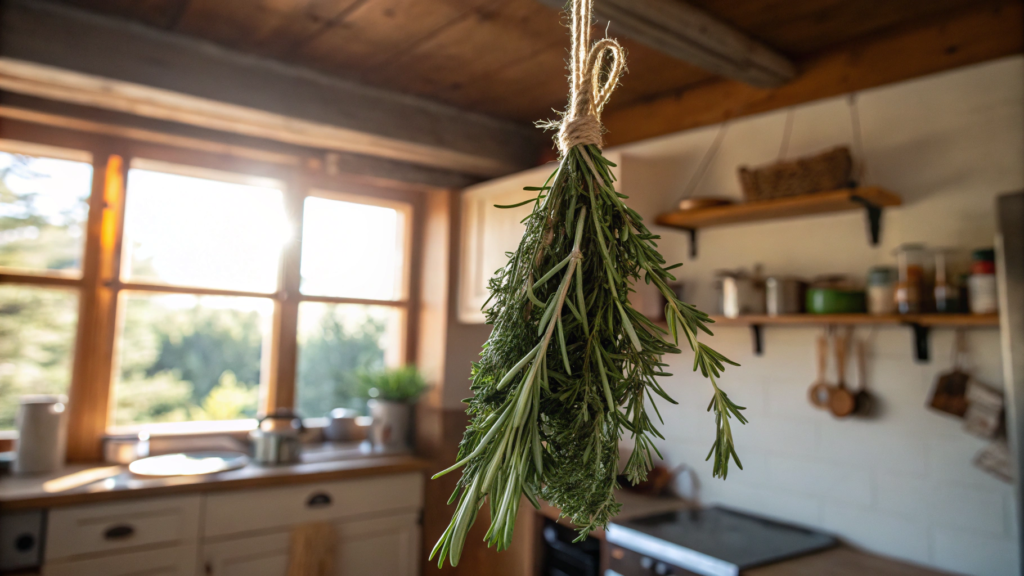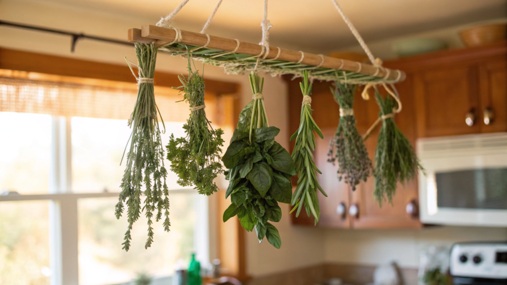 Basically, it’s a DIY rack where you hang small bundles of fresh herbs — rosemary, mint, sage, basil, whatever you’ve got. They dry peacefully right overhead — it’s beautiful, convenient, and not a single leaf ends up buried in the pantry corners.