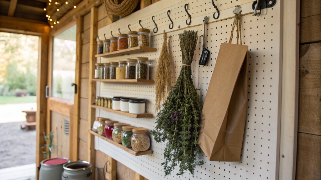 A pegboard is a perforated wall panel with hooks. You can hang anything on it — herb bundles, spice jars, paper drying bags.